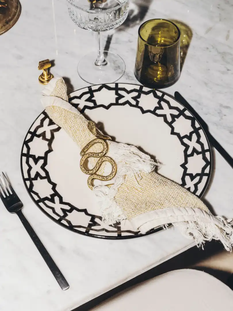 The clock is ticking towards the hour when guests will arrive but dinner-party host Rosena Charmoy is having to correct her courses after a surprise visitor has upended her meticulous run of show. A ginger cat, which appears to have stowed away inside the delivery boxes of tableware, is now weaving between chair legs, distracting staff who are attempting to focus on finalising the table setting. Rosena gently nudges her team back to their tasks. Any production in Marrakech, she tells us, needs to balance some chaos with the occasional burst of levity. Today’s gate-crashing feline might be an easily surmountable blip in pre-party preparations but with some quick finessing to the table’s 20 placements, Rosena shows why she and her husband, Fred, are born entertainers.