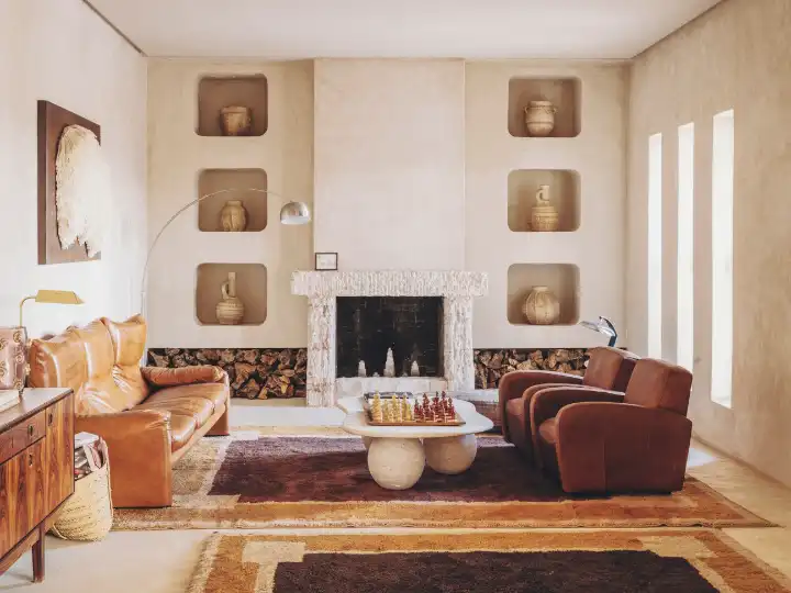 One of several cosy corners with art by Amine El Gotaibi (on left) and sofa, table, and fireplace by Soufiane Zaytoune
