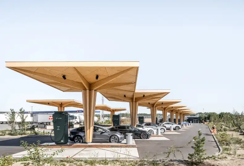 Networks of timber structures arching over ultra-fast charging stations for electric vehicles are mushrooming along highways and in cities across Scandinavia. Architecture studio Cobe has already built 11 stations in Denmark with plans to add dozens more across the region. Cobe’s founder and head architect, Dan Stubbergaard, here explains how his studio is reimagining the classic rest stop as a place to recharge EVs (and their drivers too).